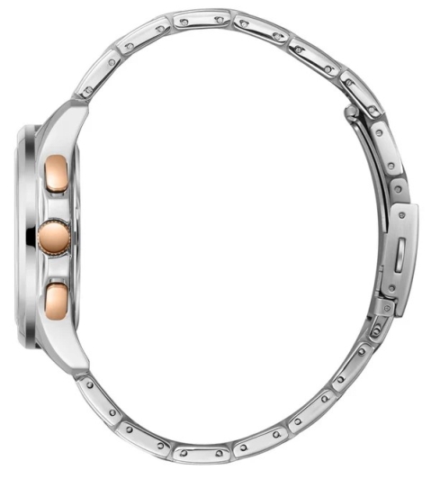 - Корпус выполнен из нержавеющей стали. Кнопки идут с IP-покрытием в цвете розовое золото. Диаметр корпуса 42 мм;